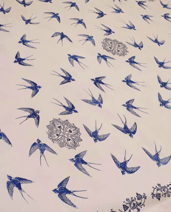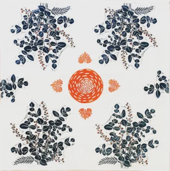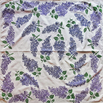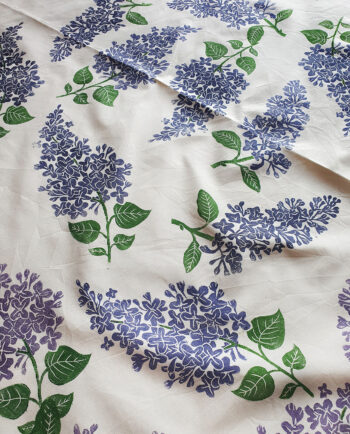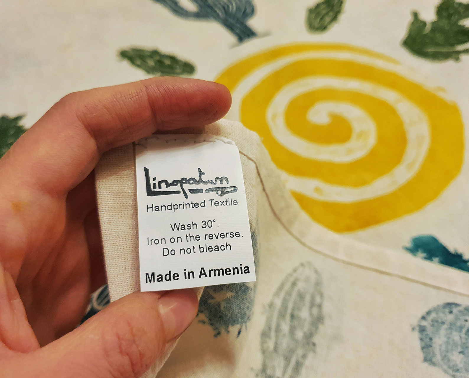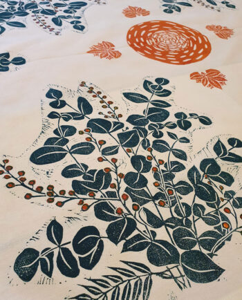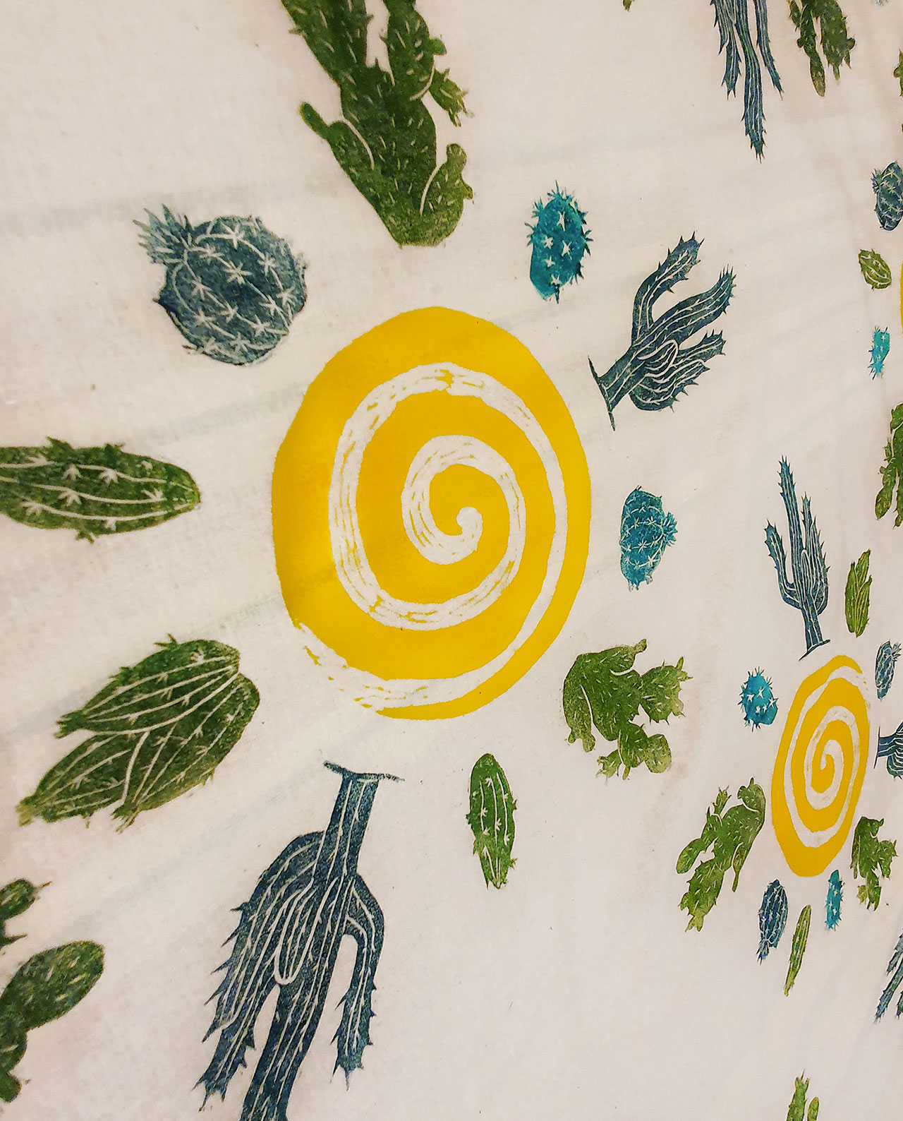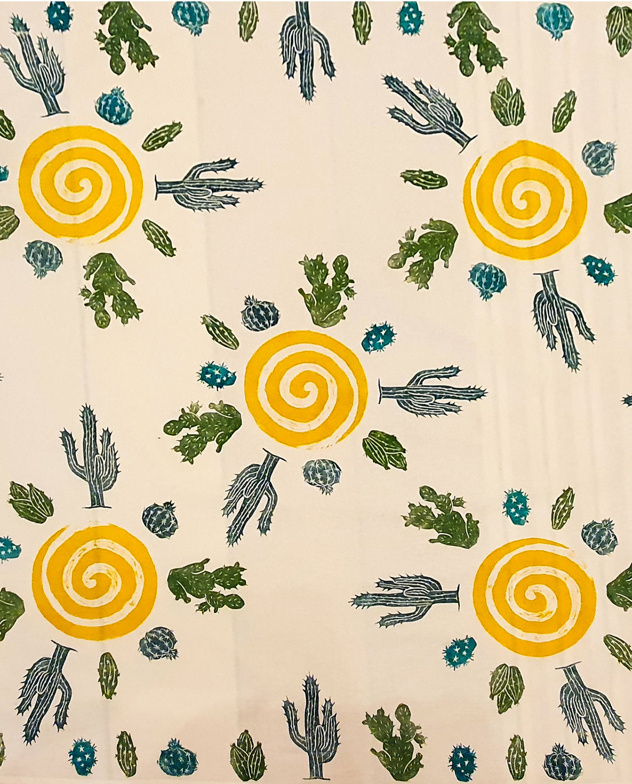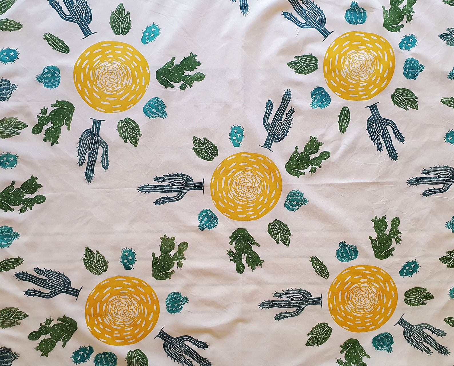 Colorful tablecloth with cacti, hand-printed with linoblock.