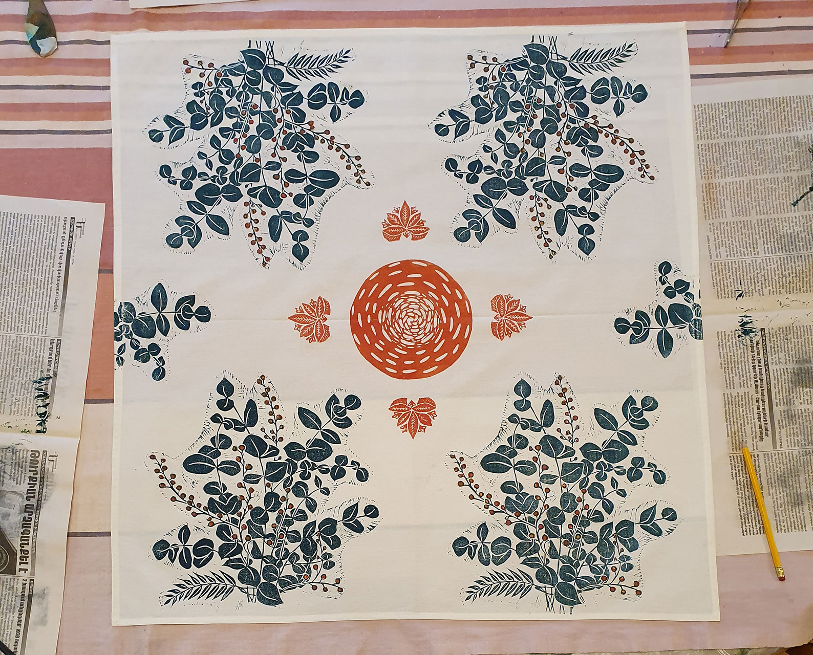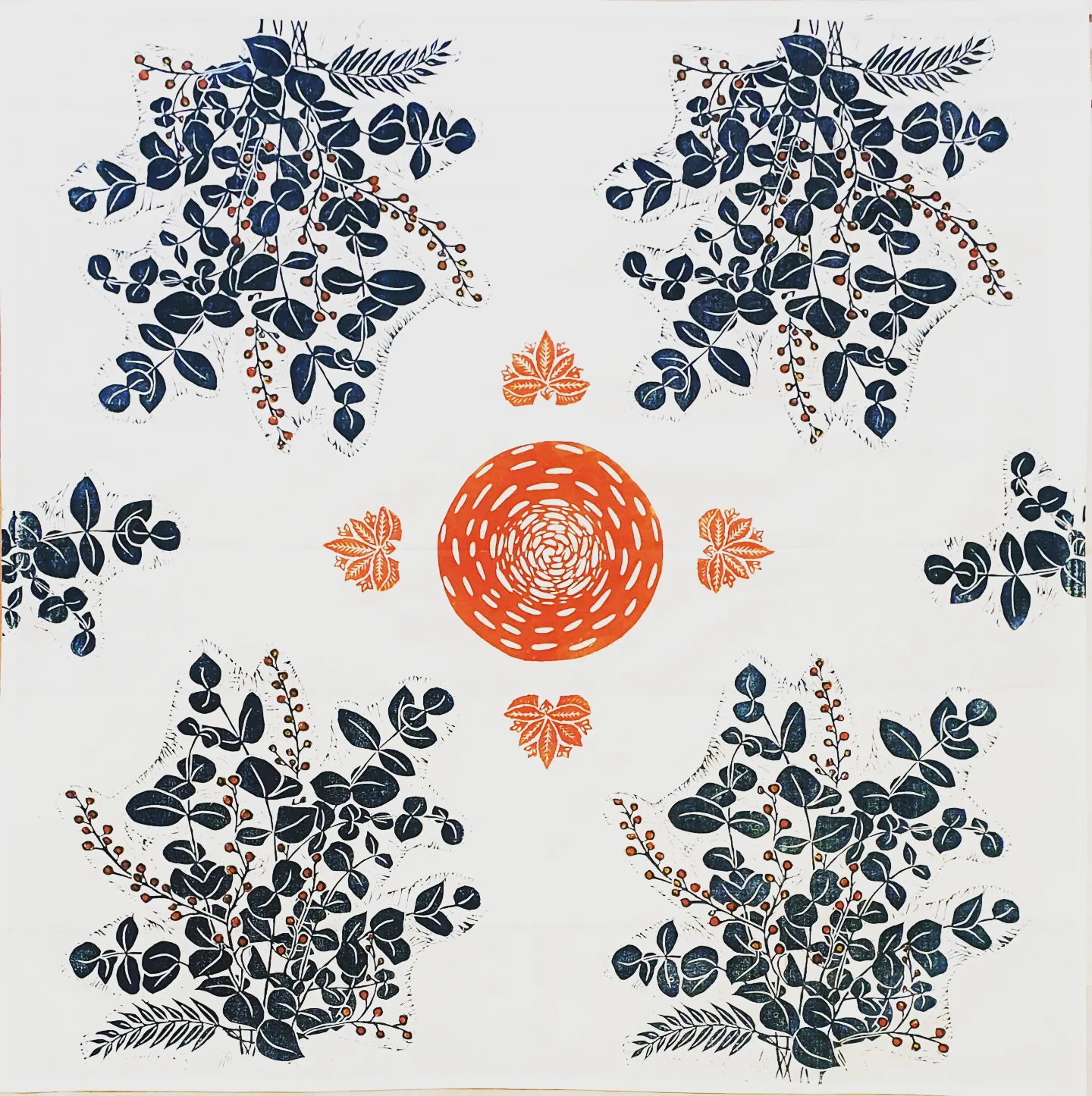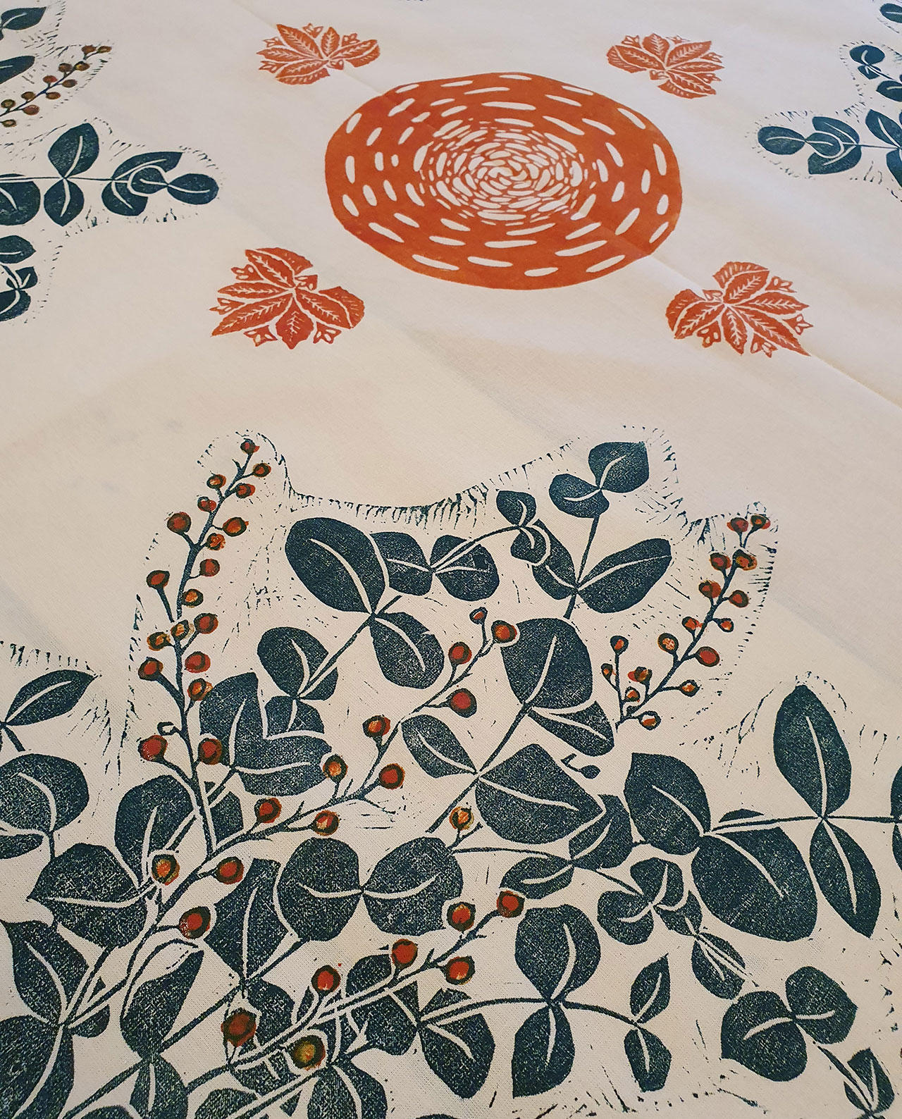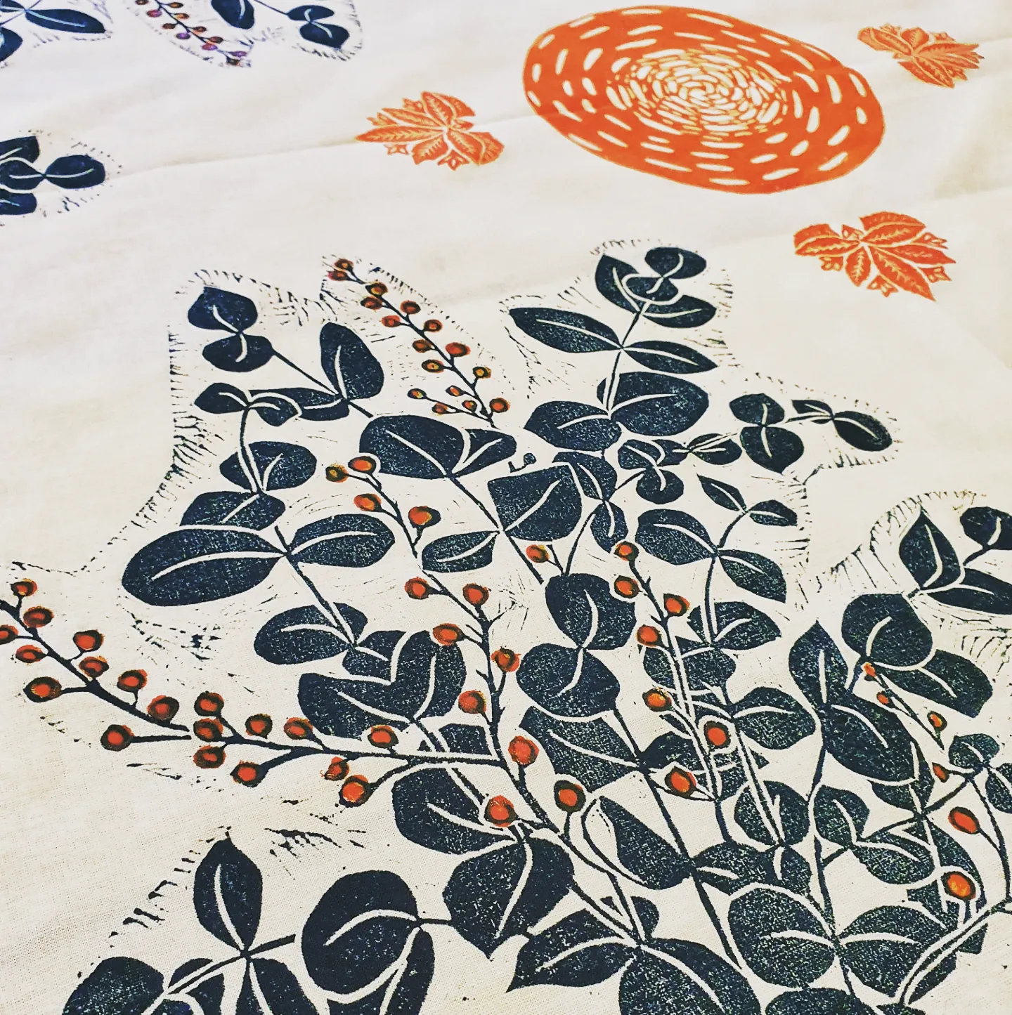 Tablecloth with eucalyptuses and orange sun, hand-printed with linoblock.