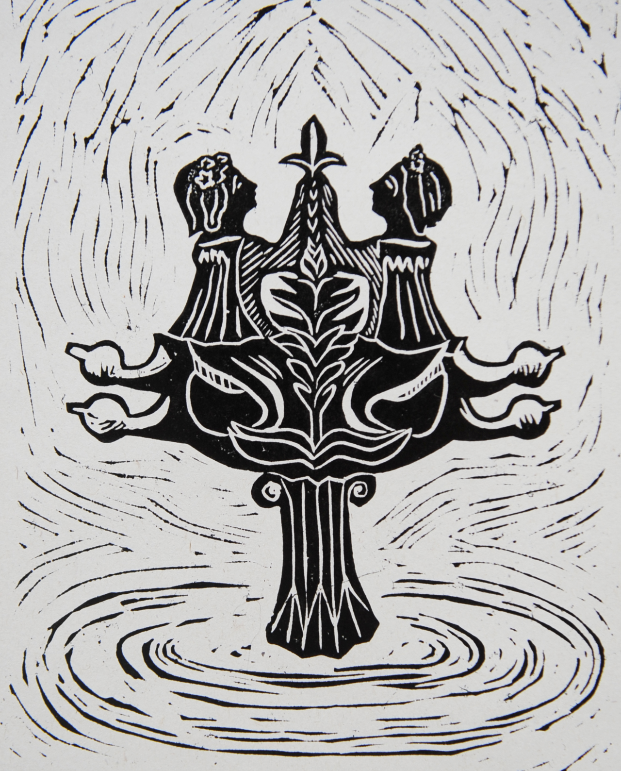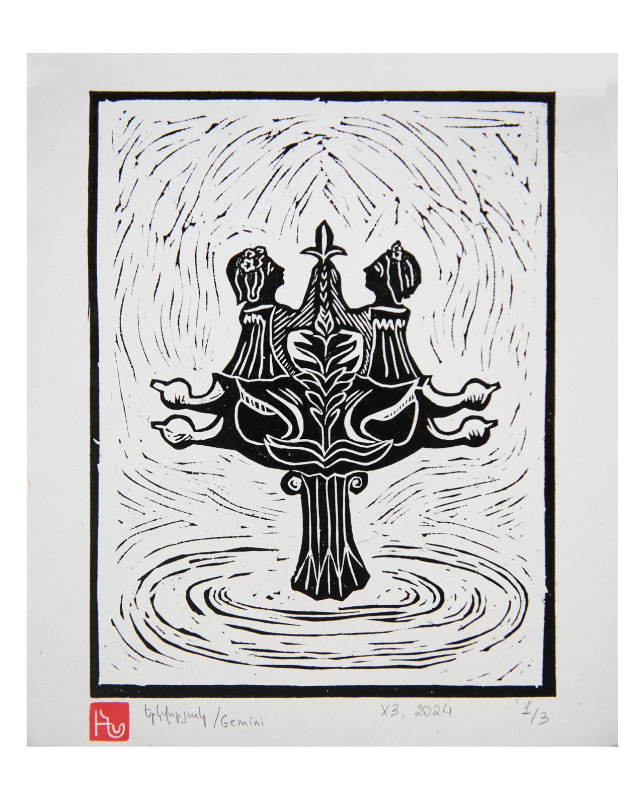 Hand-printed linocut of Gemini zodiac sign.