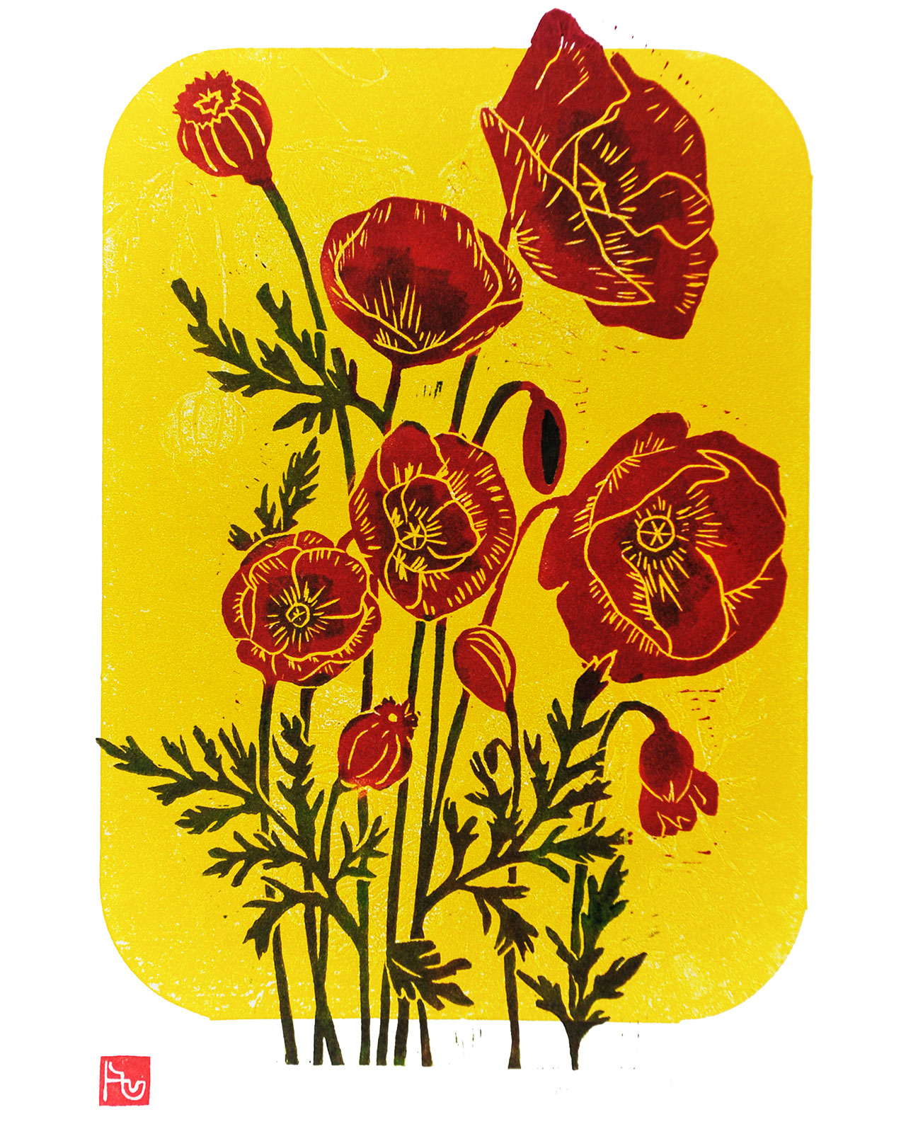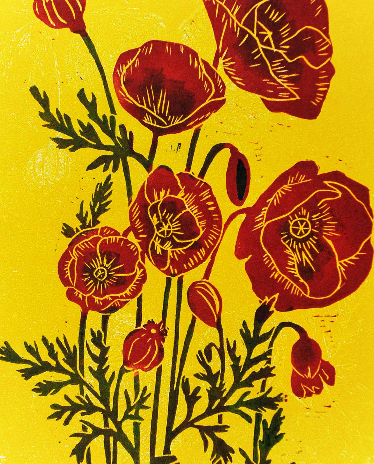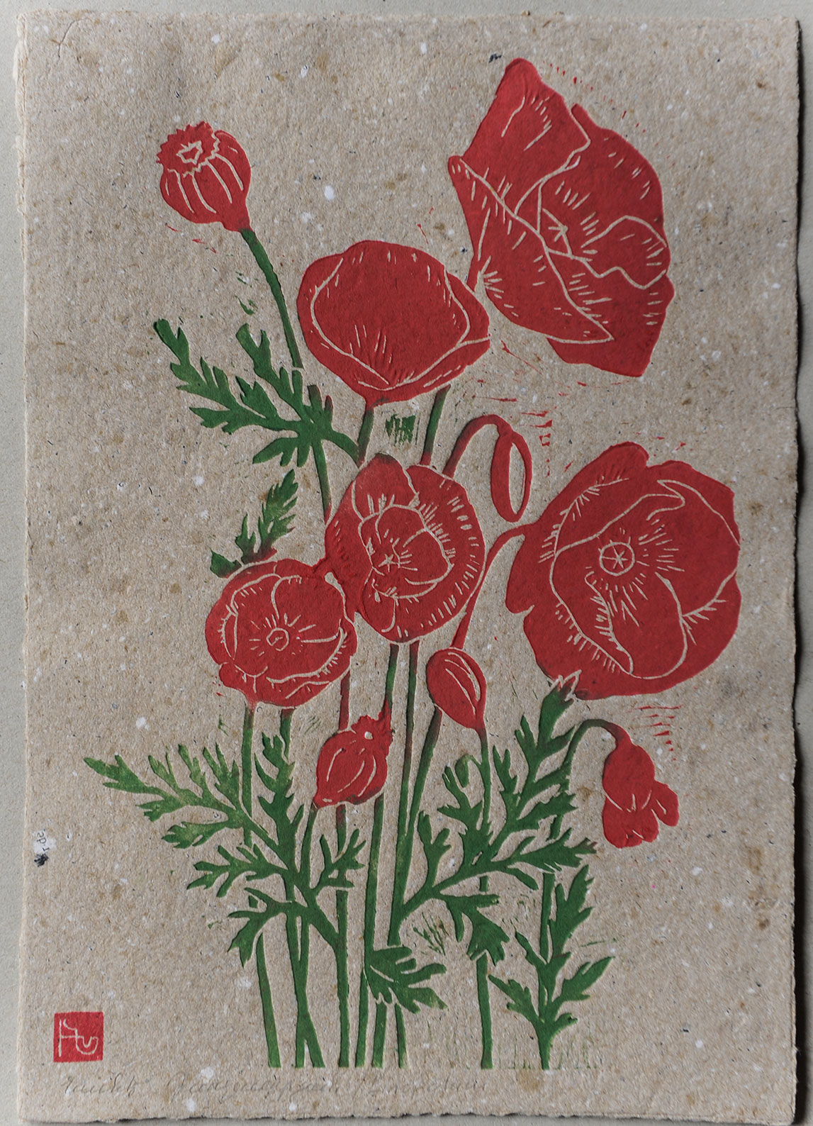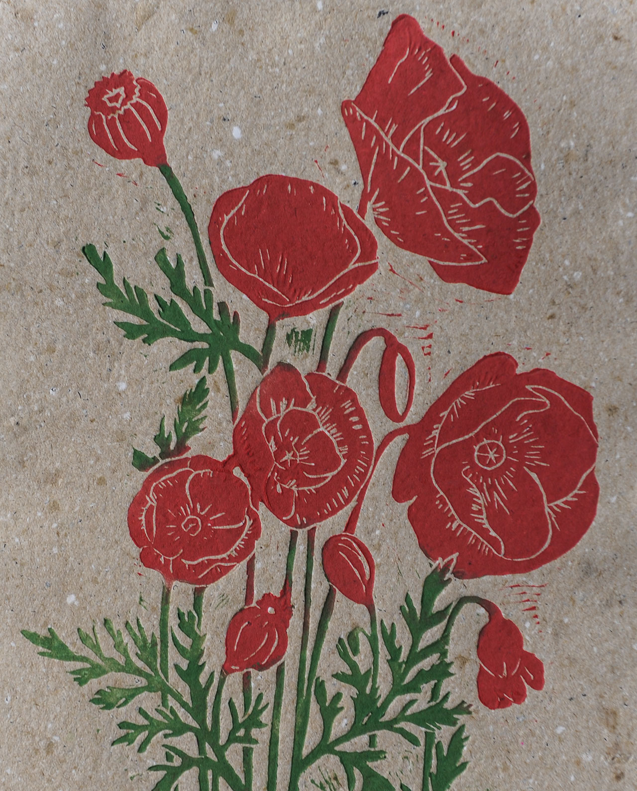 Hand-printed linocut of red poppies, printed on standard and recycled paper.