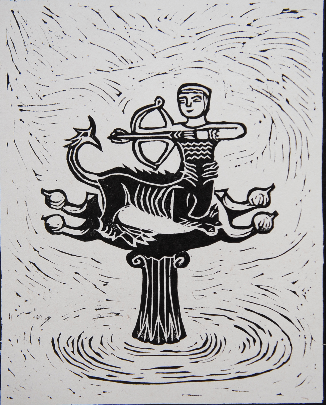 Hand-printed linocut of Sagittarius zodiac sign.