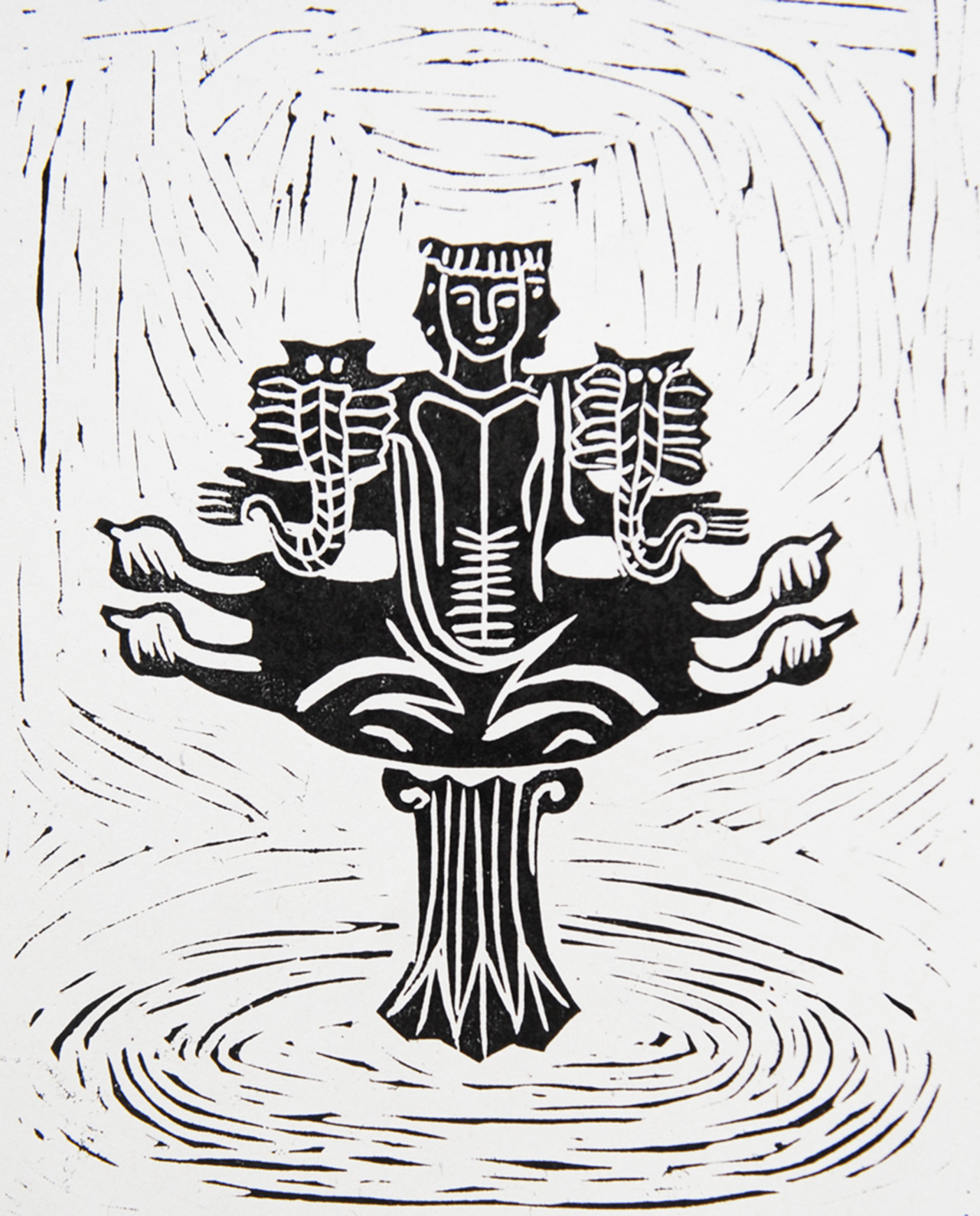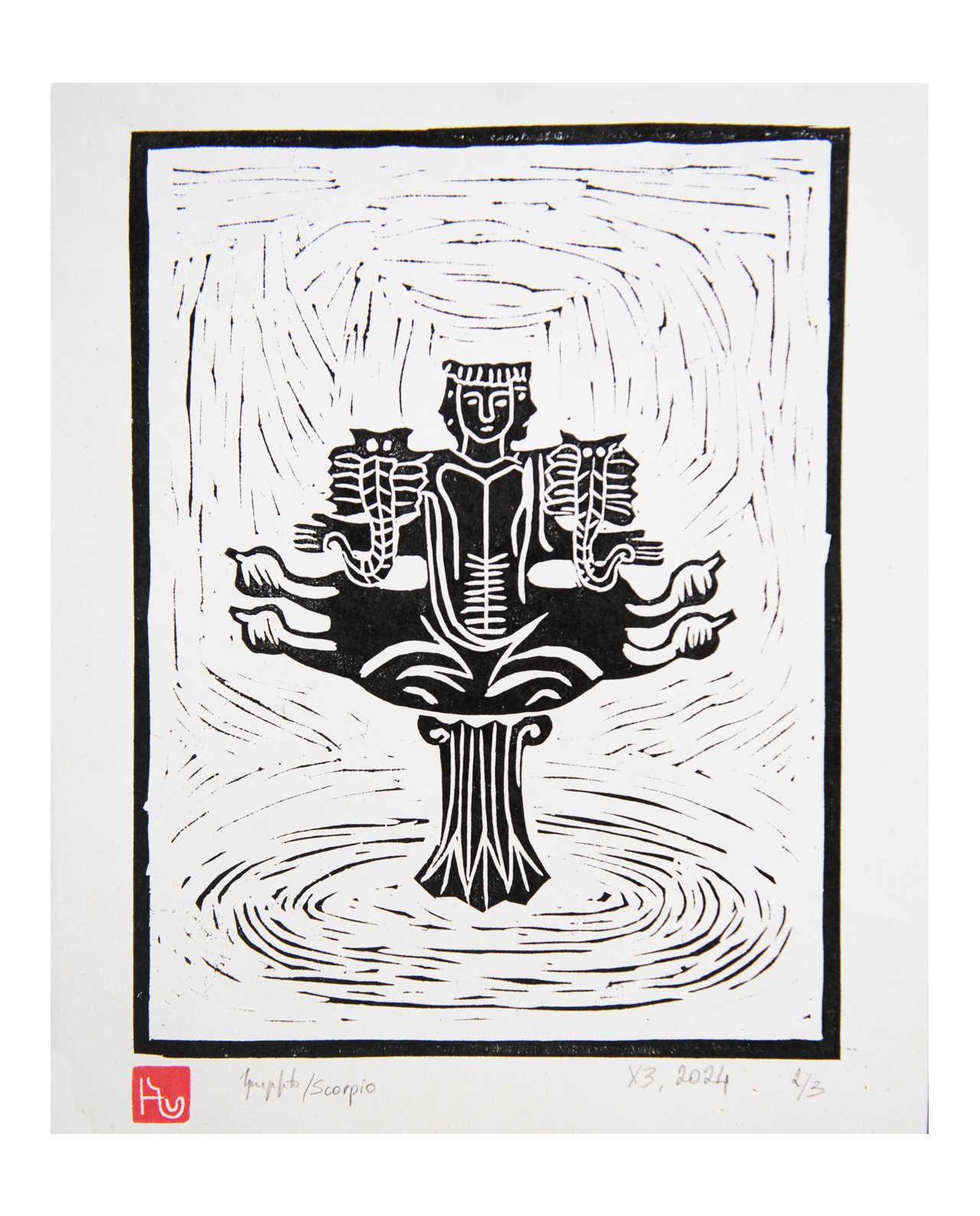Hand-printed linocut of Scorpio zodiac sign.