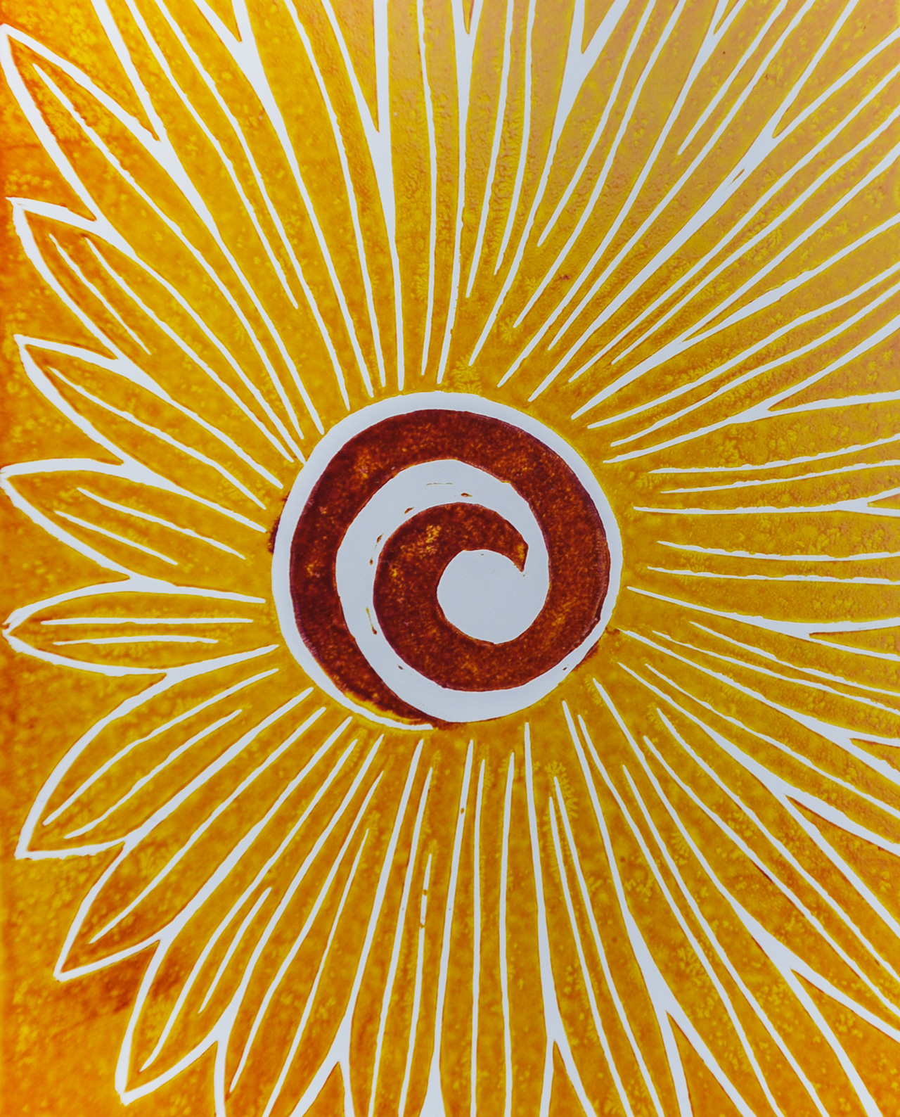 Hand-printed linocut of a sunflower, printed on standard and recycled paper.